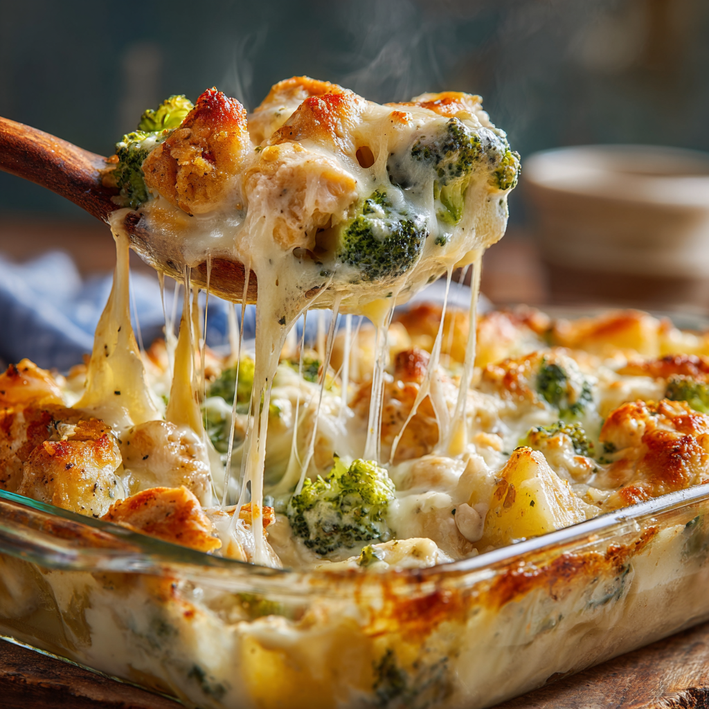 Tender chunks of potato form the foundation, soaking up a creamy, savory cheese sauce that ties the entire dish together. Juicy cooked chicken adds protein and heartiness, while roasted broccoli brings balance and a subtle roasted flavor that keeps the casserole from feeling heavy.