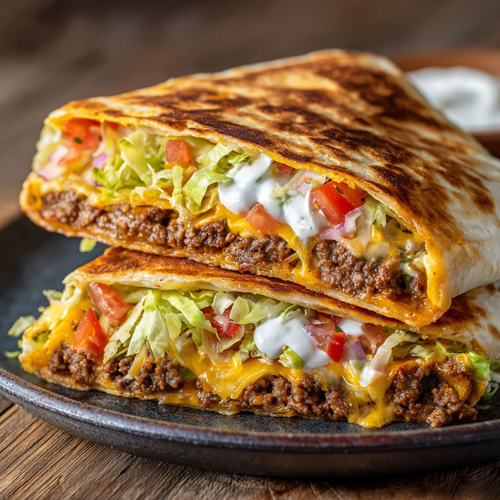 What makes this wrap so irresistible is the contrast in textures: seasoned ground beef and creamy nacho cheese layered with a crisp tostada shell, followed by cool, fresh toppings like sour cream, lettuce, and diced tomatoes—all sealed inside a large tortilla and grilled to golden perfection. It’s a satisfying balance of warmth, crunch, creaminess, and spice.