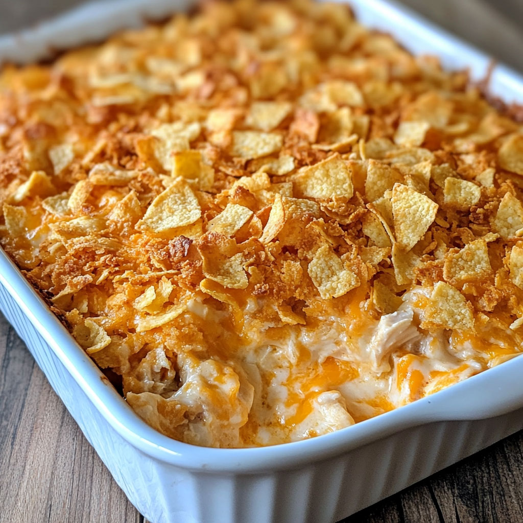 The base of shredded chicken and cream of chicken soup provides a hearty, protein-rich center, while the sour cream adds tang and extra creaminess. Cheddar cheese lends its familiar sharpness and gooey meltability, creating an ideal harmony of savory flavors. Finally, crushed potato chips are the unexpected hero here—offering texture, salt, and a nostalgic crunch that takes the dish over the top.