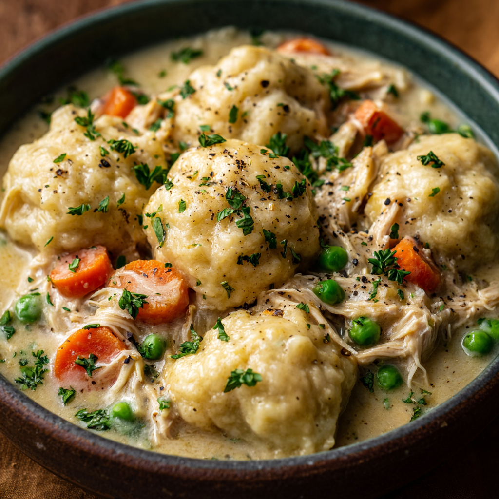 What makes this recipe so appealing is how hands-off it is. The chicken simmers gently with carrots, celery, and aromatics, creating a flavorful base that becomes even richer once the cream of chicken soup blends in. By the time the dumplings go in, the broth has transformed into a velvety, savory gravy that coats every ingredient beautifully.