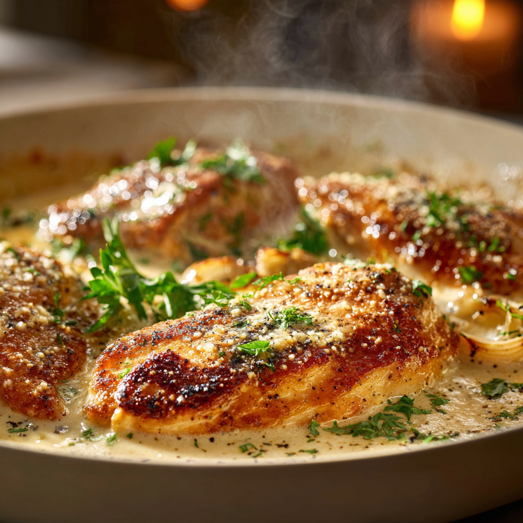 There are some dishes that feel effortlessly romantic, and this Enchant Me White Wine Parmesan Chicken is one of them. It brings together tender, golden-seared chicken and a luxurious cream sauce infused with white wine, garlic, and Parmesan—simple ingredients transformed into something truly special.