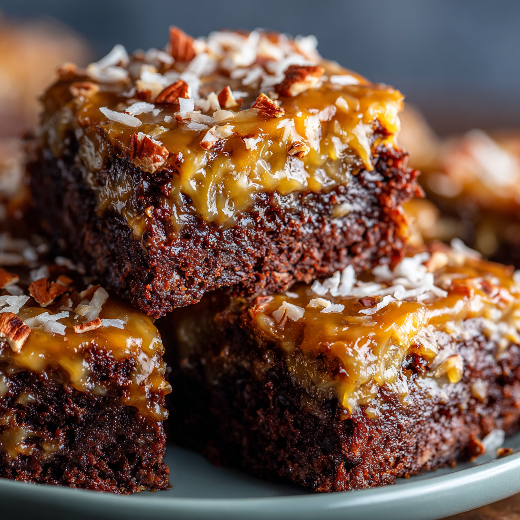 German Chocolate Pecan Brownies bring together everything you love about classic German chocolate cake—gooey coconut-pecan frosting, caramelized richness, and deep chocolate flavor—layered over a thick, fudgy brownie base. The result is a decadent dessert bar with incredible texture: soft, rich brownies topped with a luscious, buttery, nut-studded frosting that melts into every bite. It’s comfort baking at its finest, with a showstopping finish that feels both nostalgic and luxurious.