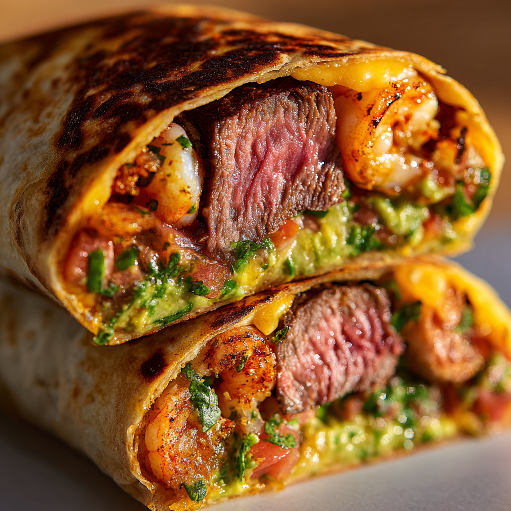 A loaded surf and turf burrito is pure indulgence wrapped in a warm tortilla. The combination of juicy steak and tender, seasoned shrimp creates a luxurious balance of flavors that feels both hearty and fresh. Each bite delivers rich protein, melted cheese, creamy guacamole, and crisp, vibrant elements that make this burrito unforgettable. It’s the kind of meal that brings restaurant-style flavor straight to your kitchen with minimal effort.
