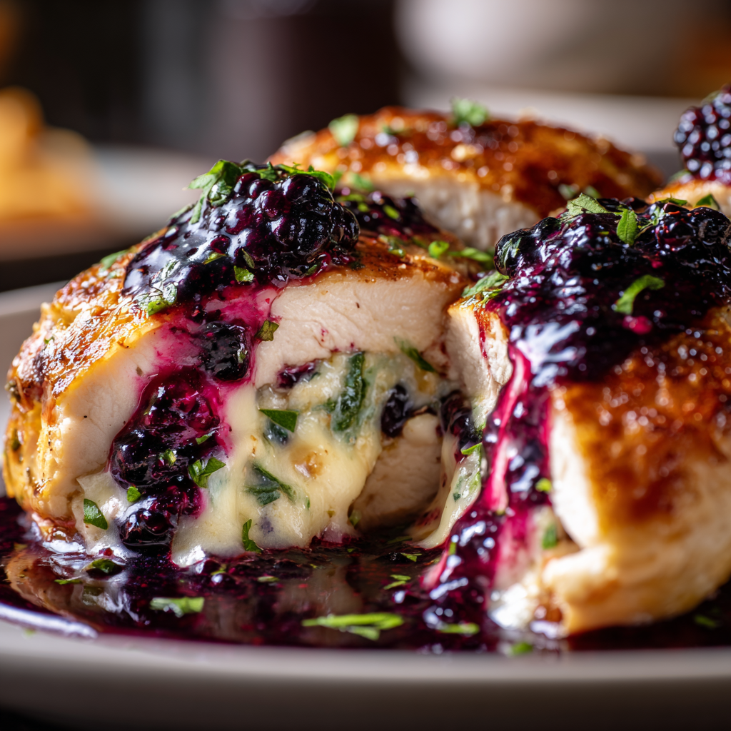 The stuffing blends mozzarella and cream cheese for that irresistible melt, while a touch of fresh herbs adds brightness. Once seared to golden perfection and baked until tender, the chicken becomes the perfect canvas for the vibrant blackberry jalapeño sauce.