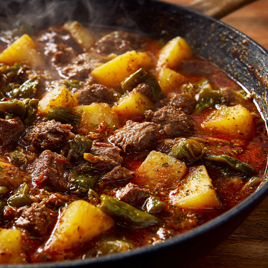Green chiles are the soul of this dish. Fire-roasted Hatch-style chiles bring a smoky, earthy heat that defines New Mexican cuisine. They don’t overpower the beef or potatoes but instead weave through the dish, giving it warmth and depth that lingers with every bite.