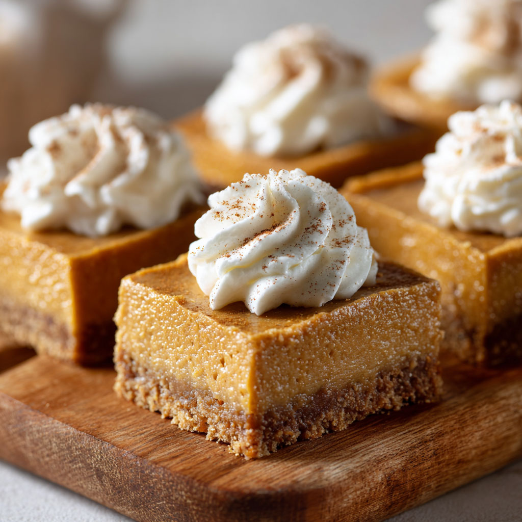 Unlike traditional pumpkin pie, these bars require no rolling or crimping, and they slice neatly into squares once chilled. That makes them ideal for potlucks, dessert tables, or make-ahead holiday treats. Just add a dollop of whipped cream on each bar before serving for that classic finishing touch.