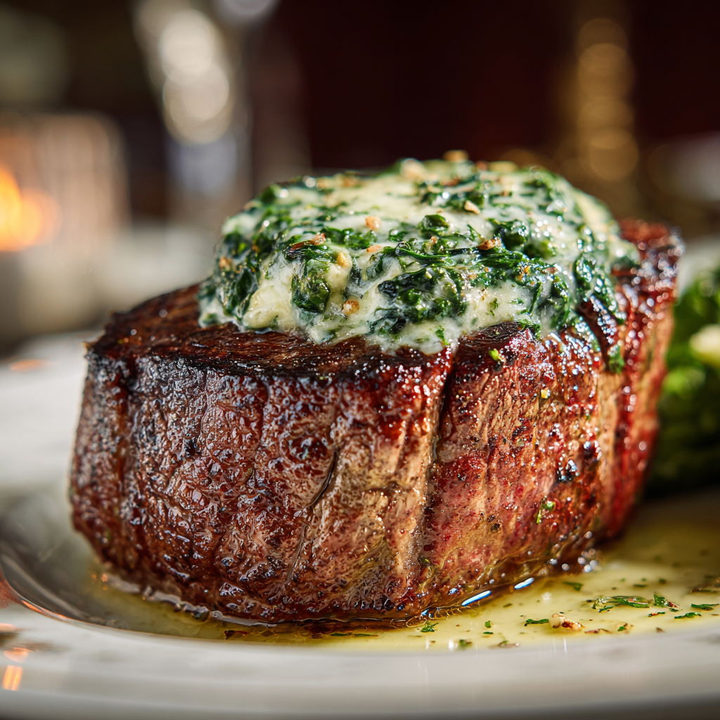 This Ruth’s Chris–inspired Filet Mignon with Spinach Rockefeller Topper brings classic steakhouse elegance straight to your home kitchen. Tender, buttery filet mignon is cooked to perfection, then crowned with a rich, creamy spinach Rockefeller topping that adds indulgence without overpowering the steak.