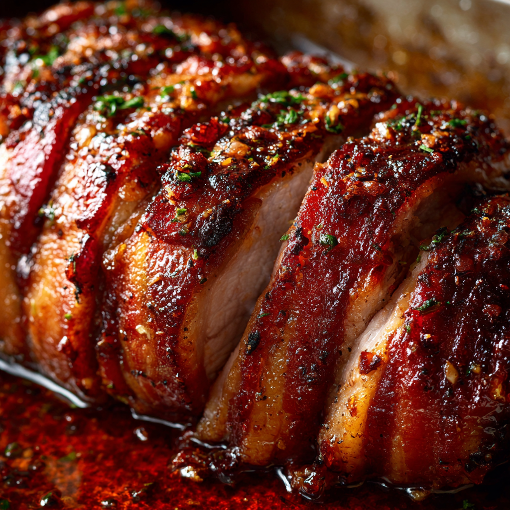 This smoky bacon-wrapped pork is the kind of dish that commands attention the moment it comes out of the oven. Juicy pork is coated in a bold, smoky-sweet sugar rub, then wrapped in crisp bacon that bastes the meat as it roasts. The result is rich, glossy, and deeply satisfying.
