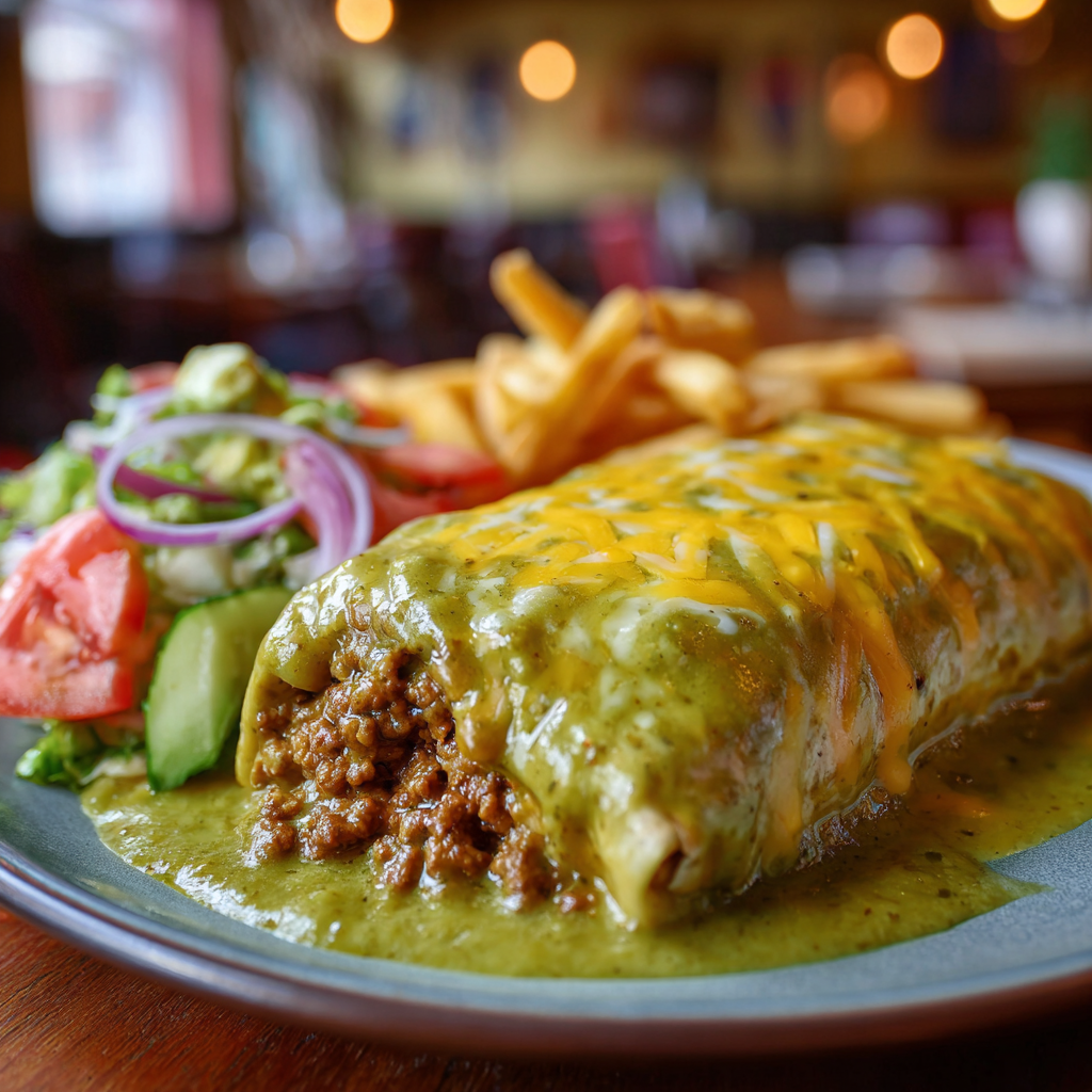 The seasoned ground beef filling is simple but deeply flavorful, providing a savory backbone that pairs perfectly with the green chile. Once smothered and finished with cheese, the burrito becomes fork-and-knife comfort food at its best.
