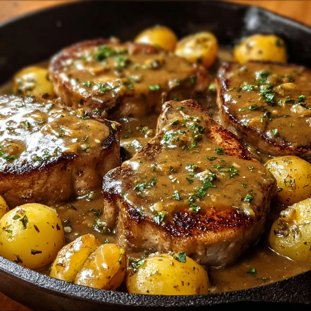 The pork chops are seared to a golden crust, locking in juices and flavor before being gently simmered with buttery baby potatoes. As the ingredients cook together, they create a velvety gravy that clings to every bite—infused with garlic, onion, and a medley of dried herbs. The combination is satisfying and deeply flavorful, perfect for a cool evening or Sunday family meal.