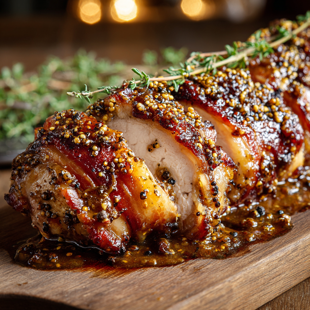 What makes this recipe shine is the contrast of textures and flavors. The pork loin stays moist and succulent thanks to the bacon wrap, while the glaze seeps into every layer, creating a glossy, sticky coating that clings to the meat. Dijon and whole-grain mustard add depth and a gentle bite, while honey brings warmth and richness.